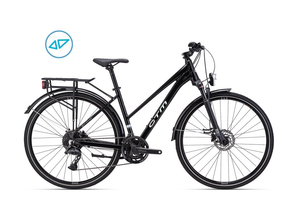 Dámsky bicykel, ktorý je určený na jednoduché presuny po cestách, chodníkoch a nespevnených povrchoch. Znížený rám ponúka vysoký komfort pri nastupovaní a vystupovaní. Výškovo nastaviteľný predstavec umožňuje správne nastaviť pozíciu pri jazde. Vzduchová odpružená vidlica Suntour NCX32 bezpečne stlmí nečakané nárazy. Veľký rozsah prevodov na každý štýl jazdy a plynulé radenie je docielené spoľahlivými komponentami Shimano CUES. Trekingová výbava tohto modelu naviac obsahuje blatníky, stojan a svetlá.Dodatočné parametre